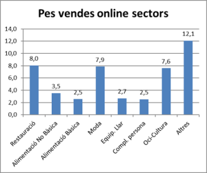 Els sectors que han tingut més pes en línia respecte a la seva facturació són Altres (12,1%), Restauració (8%), Moda (7,9%), Oci-Cultura (7,6%), Alimentació No Bàsica (3,5%), Equip. Llar (2,7%), Compl. Persona (2,5%) i Alimentació Bàsica (2,5%).