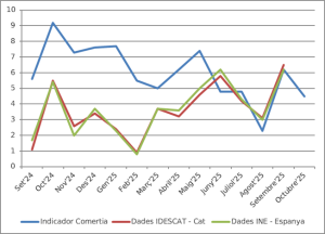 Finalment, tal com s’observa al gràfic, la tendència de vendes de l’indicador de Comertia segueix una línia paral·lela a les dades de l’INE i de l’IDESCAT, si bé des de l’agost de 2023, amb unes dades superiors però de tendència similar. El diferencial entre l’indicador i les dades oficials es deu a l’increment de punts de venda pel dinamisme de les empreses de Comertia amb l’evolució de vendes a superfície constant.